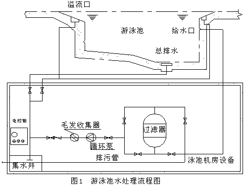 游泳池池水從池底部排水管和池岸溢水管流出,通過(guò)各控制閥門在機(jī)房匯合,經(jīng)投藥器加沉淀劑后,通過(guò)毛發(fā)收集器進(jìn)行粗過(guò)濾,然后再由水泵把水找入過(guò)濾器項(xiàng)部,水經(jīng)過(guò)過(guò)濾材料過(guò)濾后,從過(guò)濾器底部流出后的干凈水再經(jīng)過(guò)投藥泵加消毒劑后,由泳池池壁的給水口均勻注于池中,《游泳池水處理流程圖見(jiàn)下圖》
