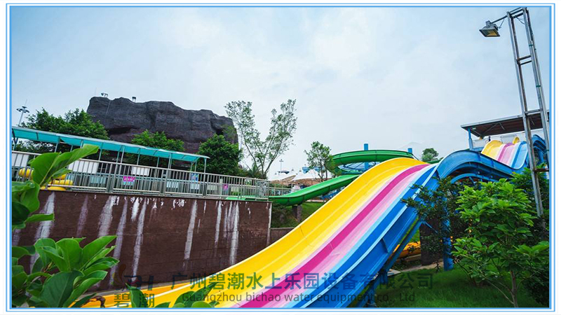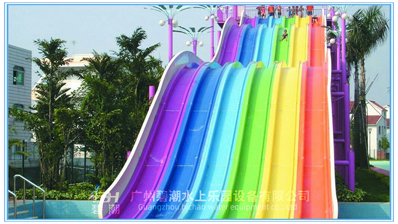 1. 水上樂(lè)園設(shè)備彩虹滑梯主體采用高性能的玻璃鋼復(fù)合材料,手工工藝糊制,具有非常強(qiáng)的韌性和硬度,安全,耐用。