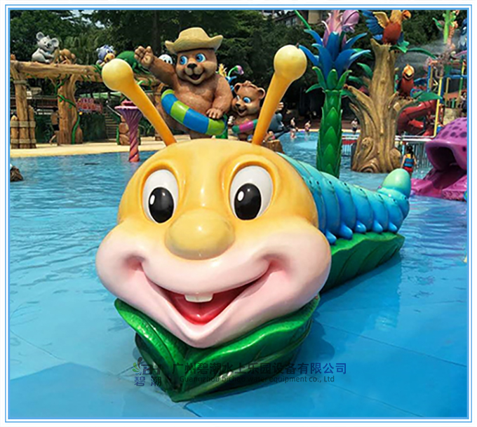 水上樂(lè)園設(shè)備戲水小品大青蟲(chóng)滑梯整體設(shè)計(jì)前端,制作精良、線條流暢、色彩鮮艷、栩栩如生。它設(shè)計(jì)得就跟“花千骨”里的糖寶一樣。頭上兩只觸角,笑呵呵的還露出兩顆兔子牙。特別卡通,特別可愛(ài)。加上噴水效果讓孩童仿佛置身于童話世界。特別適合水上樂(lè)園設(shè)備親子戲水樂(lè)園水上滑梯的一款輔助設(shè)備。廣州碧潮提供設(shè)計(jì)生產(chǎn)施工一體化打造。