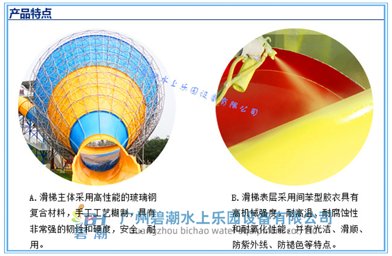 B. 滑梯表層采用間苯型膠衣具有高機(jī)械強(qiáng)度,耐高溫、耐腐蝕性和耐氧化性能,并有光潔、滑順、防紫外線、防褪色等特點(diǎn)。