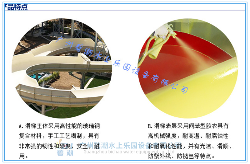 B. 滑梯表層采用間苯型膠衣具有高機(jī)械強(qiáng)度,耐高溫、耐腐蝕性和耐氧化性能,并有光潔、滑順、防紫外線、防褪色等特點(diǎn)。