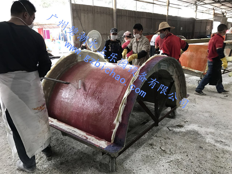 制造品質(zhì)的好壞受工藝施工方法改變。成型工序中積層一次到位是比較省事的作法但錯誤,一次過厚的積層在固化過程中化學(xué)反應(yīng)產(chǎn)生的放熱峰值髙達90℃以上,其積層結(jié)構(gòu)內(nèi)部受到燒灼破壞,這樣的廢品也許會經(jīng)過外表修飾流入市場(不用儀器無法從外觀看出是燒包品)。正確的做法是多次積層,每次積層2mm間隔3小時(表面冷卻)。正確積層只是品質(zhì)保證的第一步,之后是脫模時間控制,所謂脫模時間是指產(chǎn)品在模具上的停留時間(即后固化時間),也就是產(chǎn)品膠衣面隔絕空氣的時間,這個時間的長短與產(chǎn)品膠衣表面的光亮度堅硬度成正比,與產(chǎn)品結(jié)構(gòu)的變形度成反比,保持并延長這個后固化期是滑梯品質(zhì)保證的第二步。